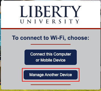 Open https://onboard.liberty.edu from a device that is connected to eduroam. Click on Manage Another Device.