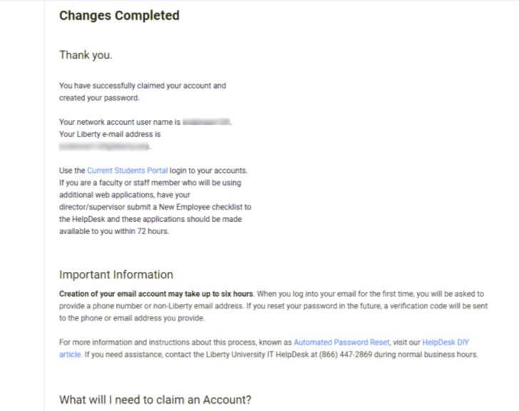 6. The next page should display your Username and email address. Using this username and the password that you just created, you will be able to log into the Liberty website and access all of the resources that are available to you, such as Email, ASIST, and Financial Check-in.