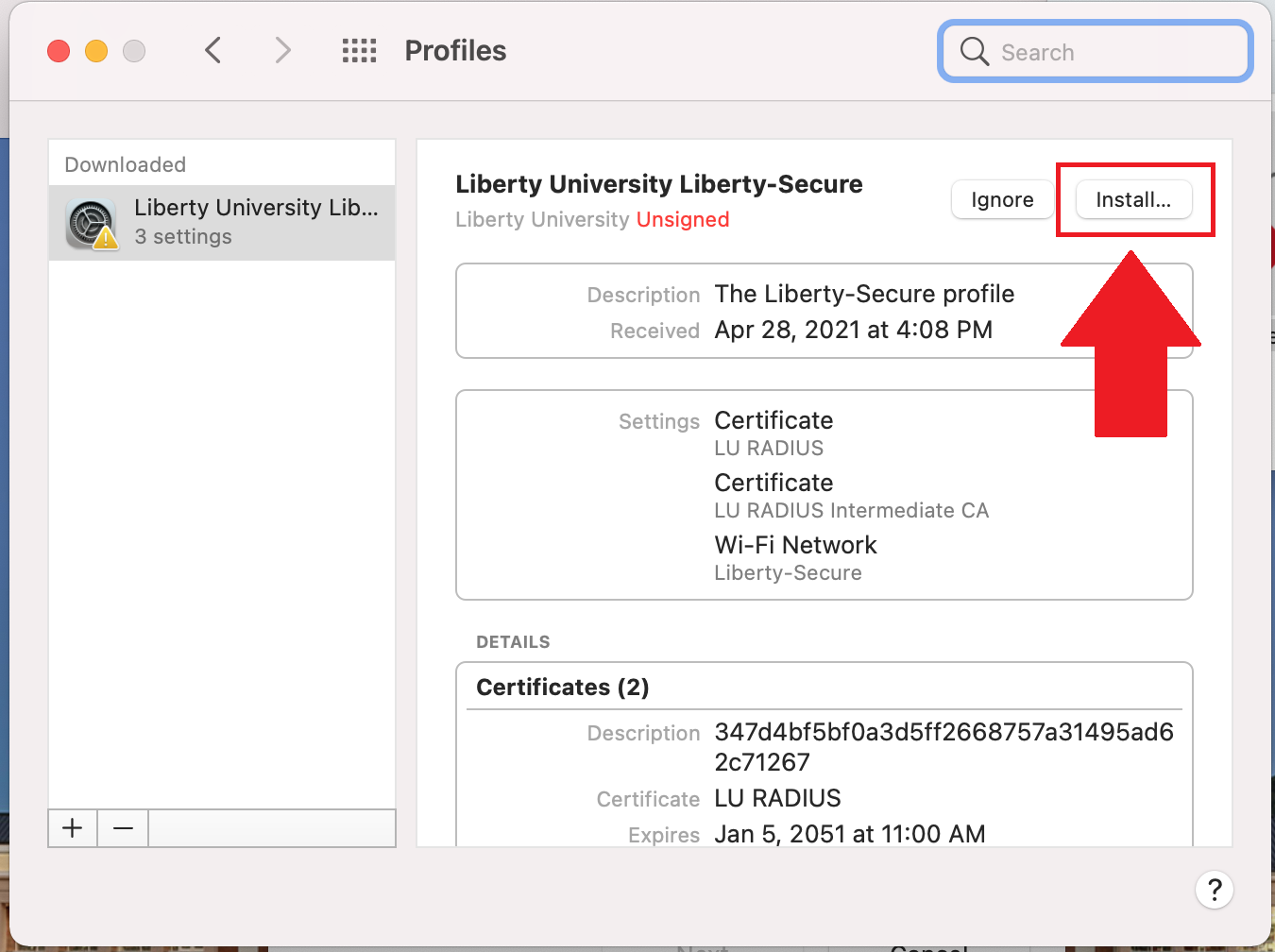 4. Select the Liberty University Liberty-Secure Mobile Profile.