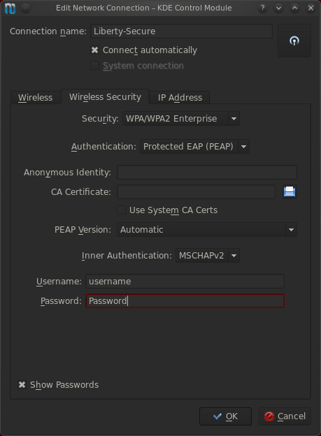 - Open the Network-Manager utility, navigate to Manage Connections (this may vary based on distribution) and choose the Liberty-Secure network.